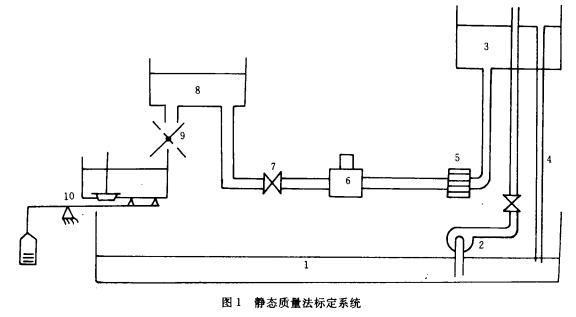 靜態標定設備一般由液體恒壓源、計量器、計時器和同步機構組成。其中計量器用標準容積時稱為容積法;使用地上衡或地中衡直接測出質量流量時稱為質量法。由於地上(中)衡精度較高,所以質量法標定精度較高,一般誤差為±0.05%~0.2%,而容積法為±0.2%~0.4%。圖1為靜態質量法標定係統。圖中,1一儲液池(水或其它介質);2一泵;3一液塔;4一溢出管;5一整流器;6一被校渦輪流量計;7**量調節閥;8一背壓裝置;9一換向器;10一地上衡。其中被校渦輪流量計之前的直管段長度應為管徑的30~50倍;之後的直管段應為管徑的10~15倍。整流器的作用是保證進人渦輪流量計的流態,消除旋轉流對測量的影響,流量調節閥應裝在流量計之後,避免閥門對流量擾動帶來誤差。標定時使用精度高德石英晶體電子秒表測量換向器2次動作之間的時間,地上衡測出這段時間流過流量計的液體質量,即可求出質量流量。由於測質量時被測液體處於靜止狀態,故稱靜態質量法。